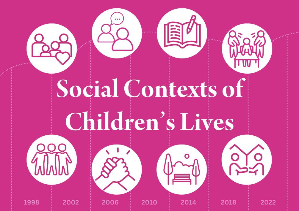Communication with children between their mothers and their fathers have seen an increase, while living with both parents and reporting of high levels of family support has decreased. In the context of peers, close friendships with those of the same sex have decreased, as have reported peer support and evenings out with friends, and communication with friends of the same sex has seen an increase. There was an overall decrease in the proportion of children reporting liking school, experiencing high levels of teacher support, while feeling pressured by schoolwork, and reports of having been bullied have increased. Children reported feeling less safe in their local area and there was a decrease in reporting being able to ask neighbours for help. Conversely, there was an increase in reporting that there are good places to spend free time.